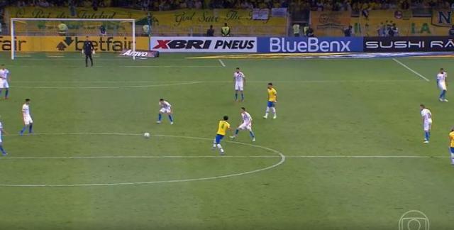 主场作战,巴西队完全压制住了巴拉圭,控球时间比高达79%对21%。第27分钟,马尔基尼奥斯中场长传。巴拉圭反越位失误,大禁区内得球后,拉菲尼亚过掉一名防守球员,左脚劲射,皮球直飞远角,比分变成1比0。为巴西队第7次上场,拉菲尼亚打进第3球。上半场占进优势,巴西队1比0领先。